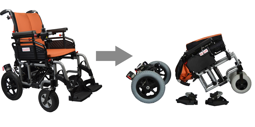 本產品需先拆卸後驅動輪後,座體骨架才可摺疊收折